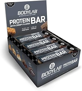 Bodylab24 Crispy Protein Bar 12 x 65g, Protein-Riegel mit 27g Eiweiß pro Riegel, Zuckerarmer Fitness Snack, Knuspriger Eiweißriegel mit vielen Ballaststoffen, Crispy Schokolade