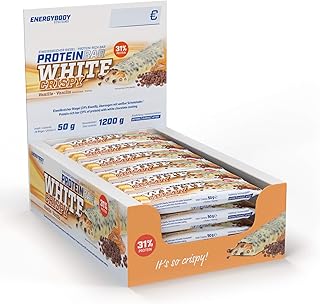 Energybody Proteinbar White Crispy Eiweißriegel Energieriegel mit 31% Protein – Protein für Fitness, Sport mit Kohlenhydraten, nur 218 kcal pro Riegel, 24 Stück à 50 g, Vanille Geschmack