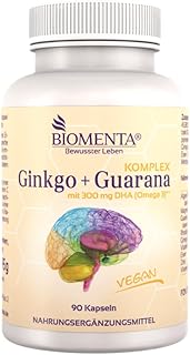 BIOMENTA Ginkgo + Guarana Komplex - vegan - mit 300mg DHA (Omega-3), Guarana (Koffein), Rhodiola, Ginkgo Biloba, Vitamin C, Magnesium, Eisen, Zink, Vitamin B12 - 90 Ginkgo Guarana Kapseln