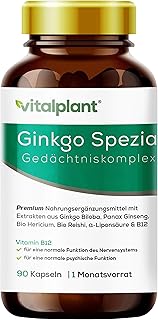 Vitalplant Ginkgo Spezial - mit Extrakten aus Ginkgo Biloba, Panax Ginseng + Bio Reishi und Hericium Vitalpilze - natürlicher Gedächtniskomplex
