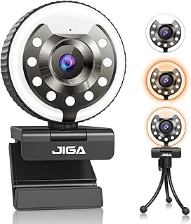 1080P Webcam mit Mikrofon、Full HD Facecam Streaming Webcams、USB Kamera mit Ringlicht、Stativ、360° Schwenken、JIGA Web Camera für PC、Videochat、p Weiß、Warmes、Natürliches Licht